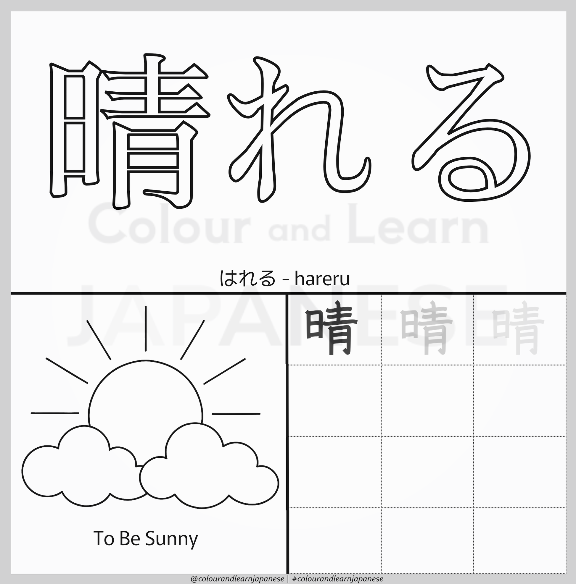 This Colour and Learn Japanese printable pack 8 of 9, "Nature and Weather", is based on "Everyday Actions-Verbs" taken at the JLPT N5 level! Each sheet features carefully curated essential vocabulary with Kanji, hiragana, romaji, and cute kawaii-style illustrations for colouring and tracing practice.