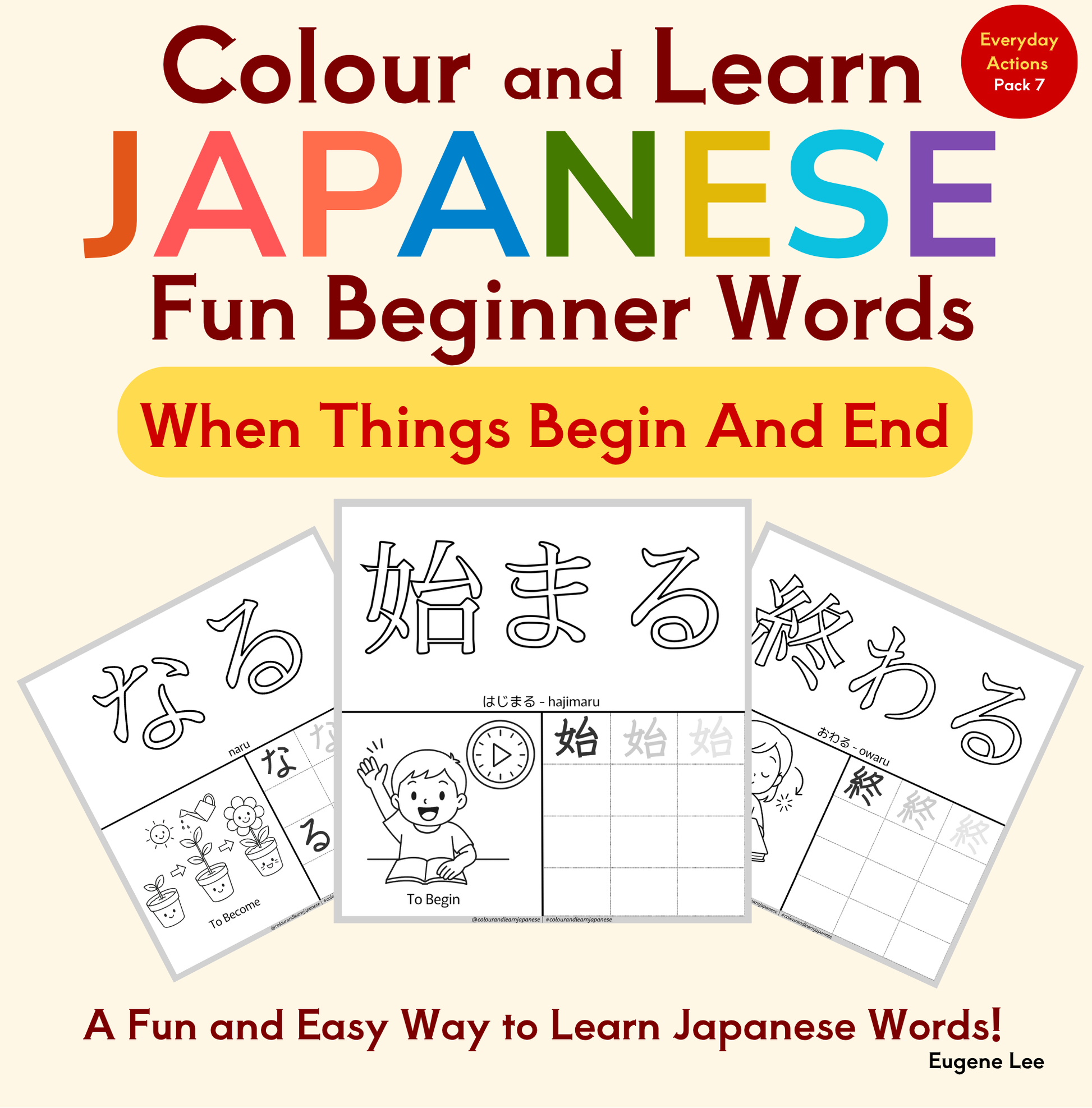 Everyday Actions-Verbs Vocabulary Printable Pack 7 of 9 (N5 Beginner Level) | Colour and Learn Japanese Fun Beginner Words: When Things Begin And End